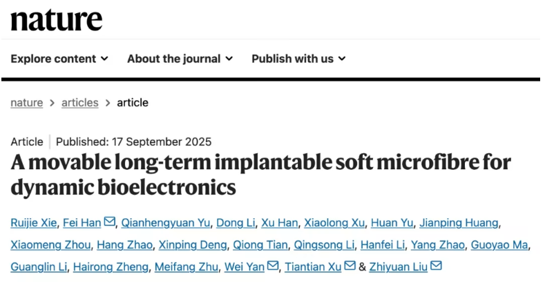 2025 年 9 月 17 日,中国科学院深圳先进技术研究院刘志远研究员、徐天添研究员、韩飞副研究员和东华大学严威教授合作,在国际顶尖学术期刊 Nature 上发表了题为:A movable long-term implantable soft microfibre for dynamic bioelectronics 的研究论文。