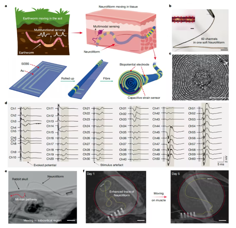 研究团队受到蚯蚓在土壤中灵活运动和分段感知能力的启发,成功开发出了一种柔性、可驱动、可长期植入的纤维电极——神经蠕虫(NeuroWorm),标志着生物电子接口(脑机接口、人机接口)从静态走向动态、从被动记录走向主动智能探测的范式转变。